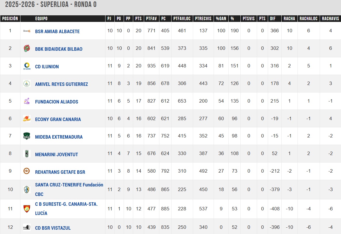 La SuperLiga Fundación ONCE llega al ecuador del campeonato disputadas once jornadas con Ilunion, Amiab Albacete y BBK Bidaideak Bilbao empatados en lo alto de la clasificación a 20 puntos, aunque el conjunto manchego y el vasco con un partido menos, el que tienen que disputar entre sí y que tuvo que ser aplazado hace unos días por las malas condiciones climatológicas.